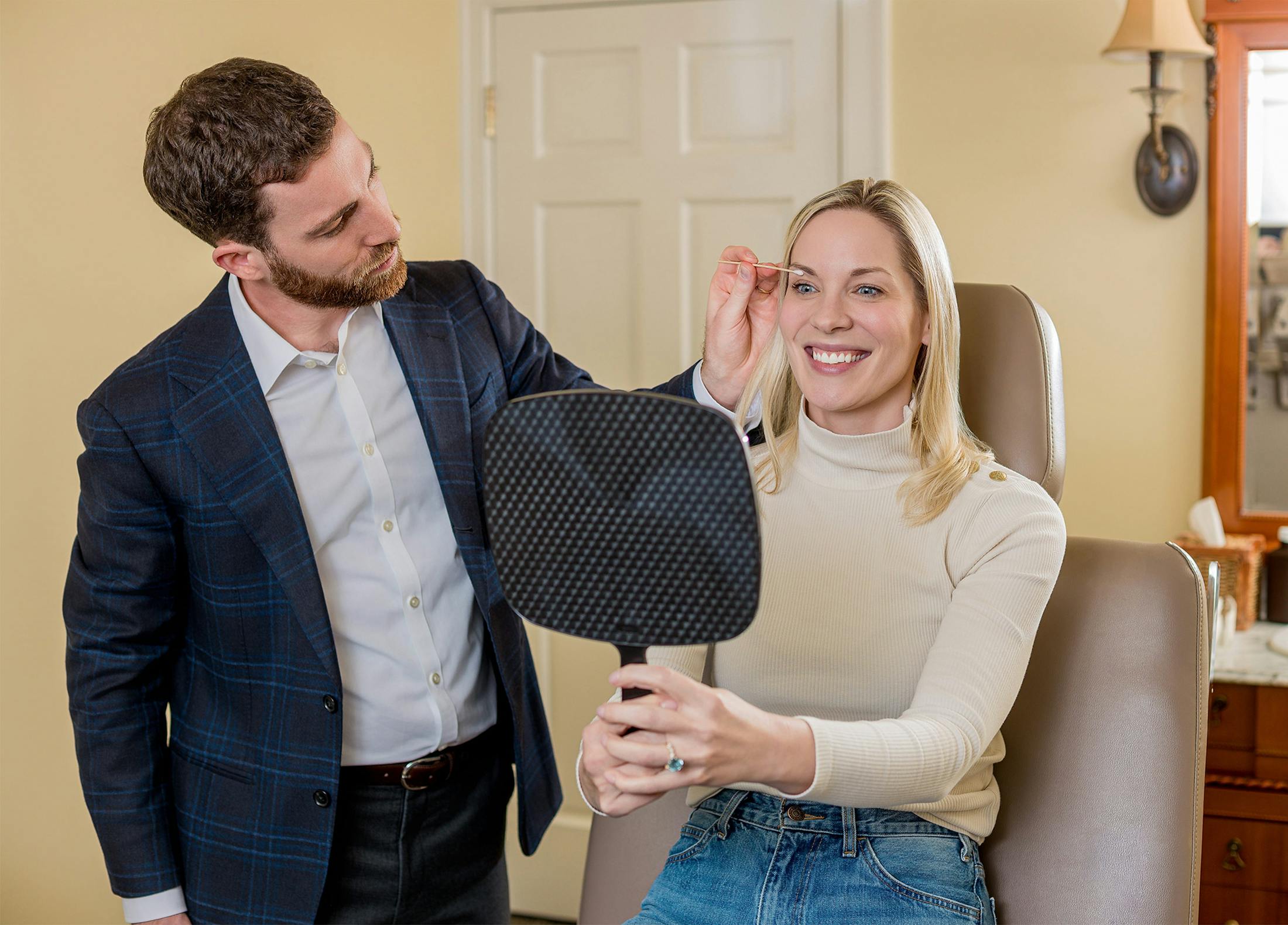 Upper eyelid surgery corrects drooping skin and fullness above the eyes that can create a shadowed, heavy, or prematurely aged appearance. By removing excess tissue and refining the natural lid fold, the eyes appear clearer and more defined without looking altered.