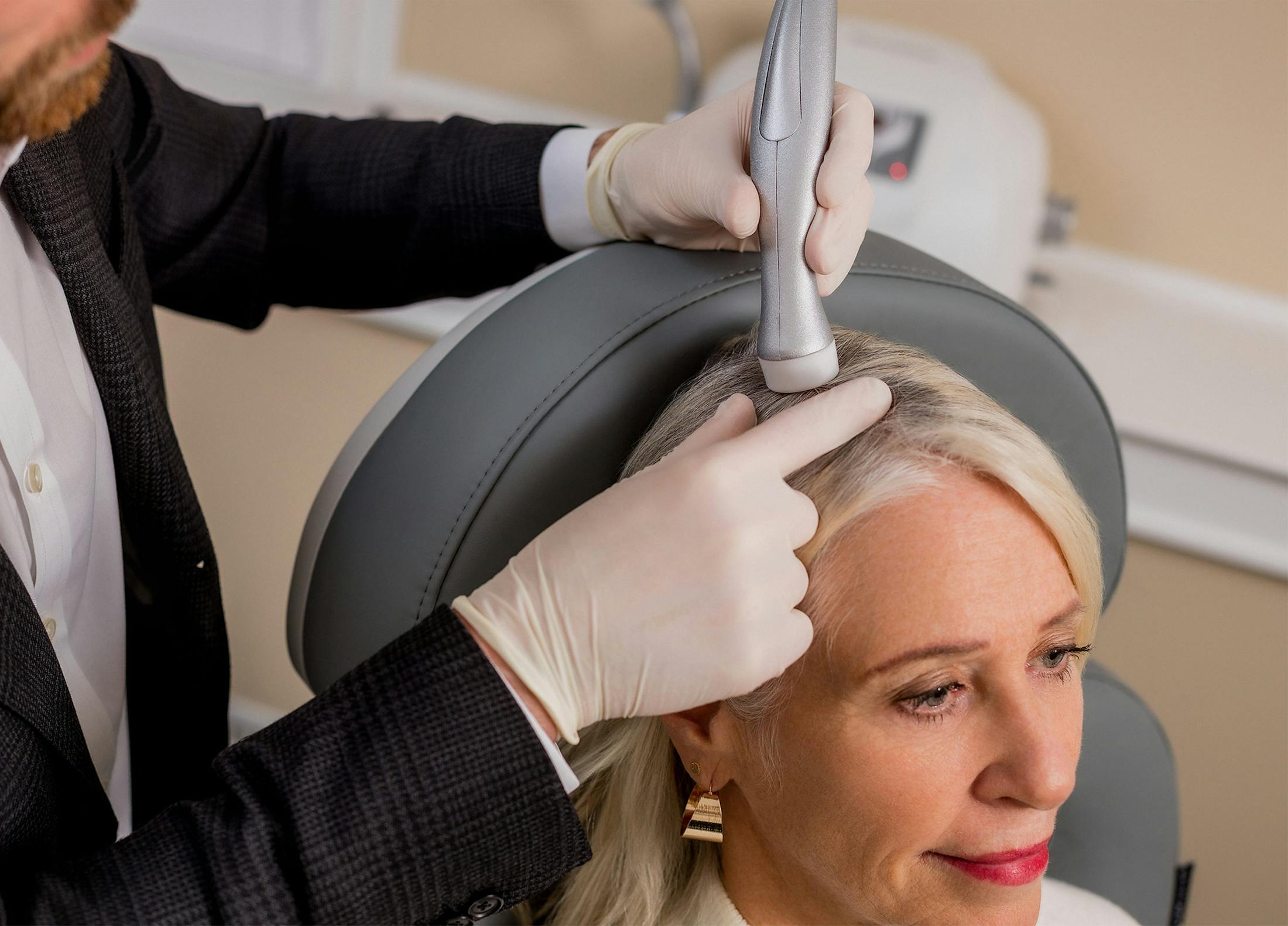 The procedure is performed in-office and typically requires no anesthesia. A specialized device is applied to the scalp to facilitate uniform delivery of selected formulations. Most patients describe the experience as comfortable, with minimal sensation beyond light pressure.